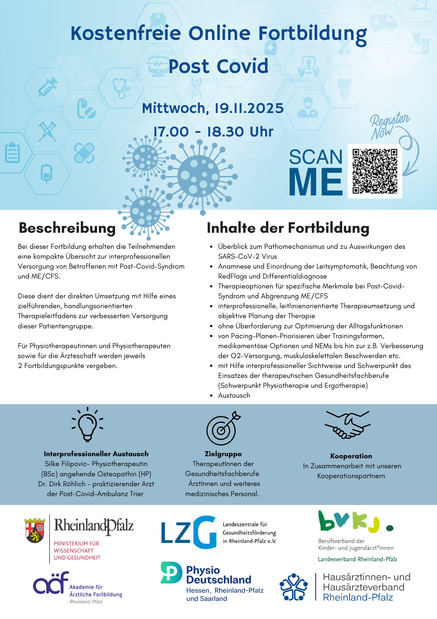 Themen sind u.a.: Überblick zum Pathomechanismus und zu Auswirkungen des Sars-CoV-2 Virus, Anamnese und Einordnung der Leitsymptomatik, Beachtung von RedFlags und Differentialdiagnose, Therapieoptionen für spezifische Merkmale bei Post-Covid-Syndrom und Abgrenzung ME/CFS, interprofessionelle, leitlinienorientierte Therapieumsetzung und objektive Planung der Therapie.